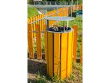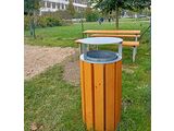 Der Abfallbehälter besteht aus Fichtenholz. Die Oberflächenbehandlung besteht in Tiefenimprägnierung und Lackbehandlung. Diese Konstruktion wird im Beton verankert. Der Mülleimer Einsatz besteht aus verzinktem Stahl. Die gesamten Metallelemente sind auch verzinkt oder die Duplexbeschichtung mit Pulvereinbrennfarbe nach der RAL geschützt. Sämtliche Verbindungselemente sind verzinkt oder aus Edelstahl.