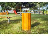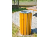 Der Abfallbehälter besteht aus Fichtenholz. Die Oberflächenbehandlung besteht in Tiefenimprägnierung und Lackbehandlung. Diese Konstruktion wird im Beton verankert. Der Mülleimer Einsatz besteht aus verzinktem Stahl. Die gesamten Metallelemente sind auch verzinkt oder die Duplexbeschichtung mit Pulvereinbrennfarbe nach der RAL geschützt. Sämtliche Verbindungselemente sind verzinkt oder aus Edelstahl.