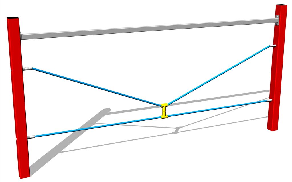 Die Seile bestehen aus HERKULESTAU (16 mm Seil aus Polypropylen mit Stahlkern) und sind mit Kunststoffgelenken verbunden. Alle Verbindungselemente sind verzinkt oder aus Edelstahl.