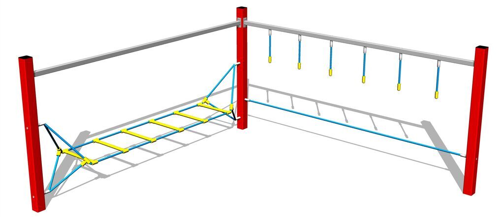 Die Seile bestehen aus HERKULESTAU (16 mm Seil aus Polypropylen mit Stahlkern) und sind mit Kunststoffgelenken verbunden. Alle Verbindungselemente sind verzinkt oder aus Edelstahl.