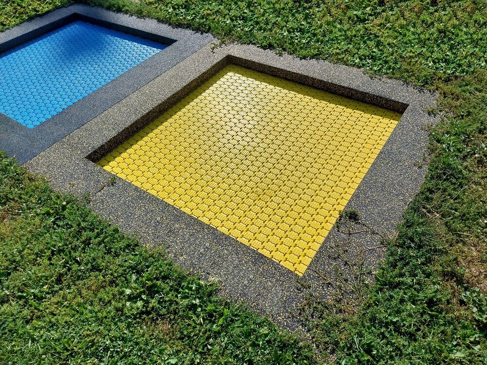 Die Dämpfungsoberfläche - ist aus speziellem recyceltem Gummi mit dem EPDM-Zusatz hergestellt. Die Dämpfungsoberfläche ist in einer Antirutsch-Ausführung und dient zur Dämpfung potenzieller Stürze