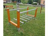 Diese Konstruktionen werden im Terrain durch feuerverzinkte Stahlpfostenträger verankert, durch Schrauben mit dem Spielelement verbunden und anschließend im Beton befestigt. Somit wird der direkte Kontakt mit dem Boden vermieden. Die beweglichen Balken bestehen aus Leimbalken und werden mit verzinkten Ketten an der Tragkonstruktion aufgehängt. Die gesamten Metallelemente sind auch verzinkt oder die Duplexbeschichtung mit Pulvereinbrennfarbe nach der RAL geschützt. Alle Verbindungselemente sind verzinkt oder aus Edelstahl.