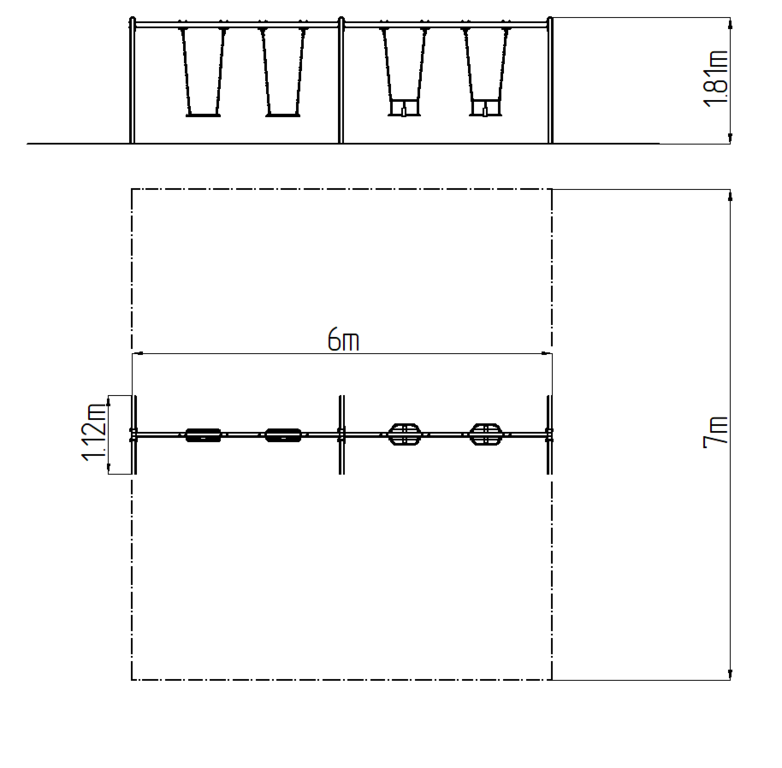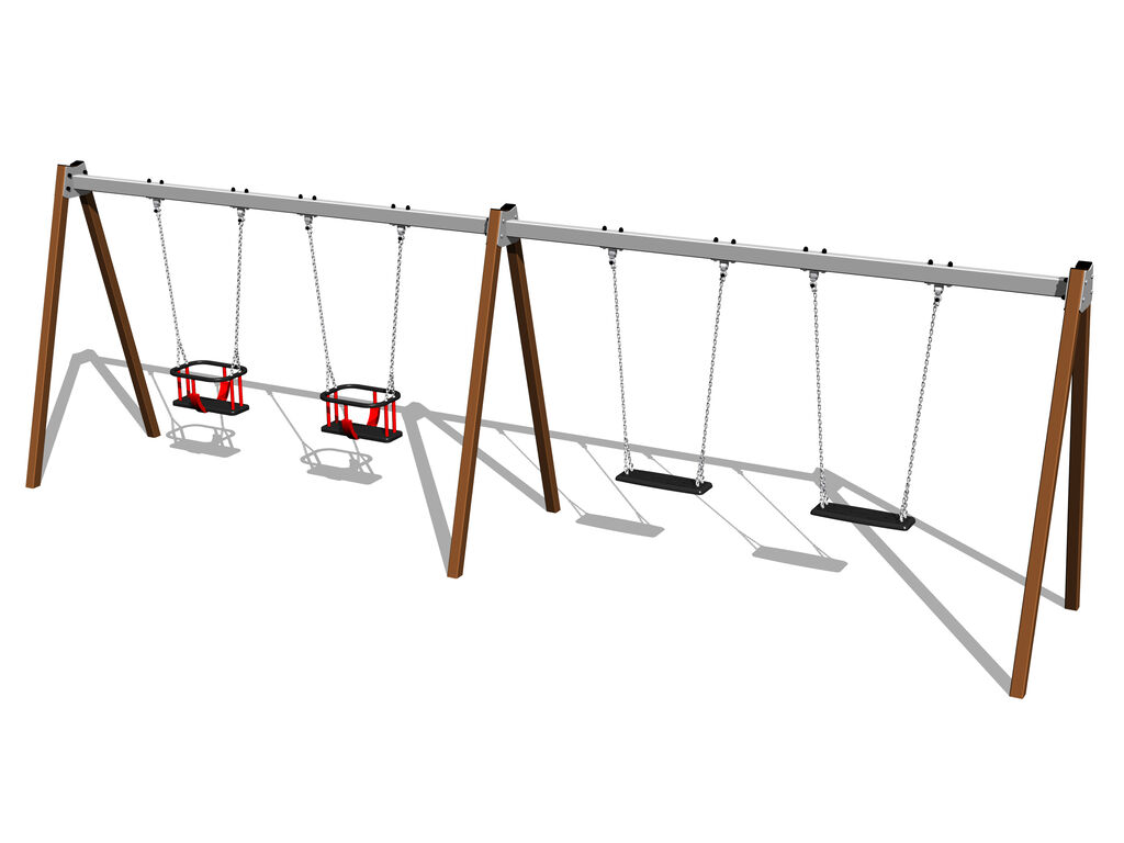 Die Tragkonstruktion der Schaukel besteht aus Konstruktionsstahl, die gegen Korrosion mit Zinkbeschichtung geschützt wird oder die Duplexbeschichtung mit Pulvereinbrennfarbe nach der RAL geschützt. Diese Tragkonstruktionen sind in die Betonfundamente verankert. Die gesamten Metallelemente sind auch verzinkt oder die Duplexbeschichtung mit Pulvereinbrennfarbe nach der RAL geschützt. Der Baby Sitz besteht aus Gummi und ist mit Aluminiumeinsatz verstärkt. Der normale Sitz besteht aus Aluminium und ist mit weichem und bequemem Gummi bezogen.