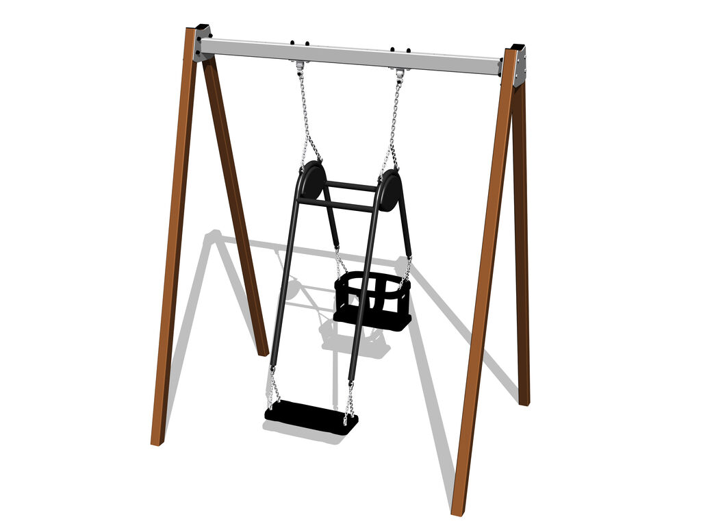 Die Tragkonstruktion der Schaukel besteht aus Konstruktionsstahl, die gegen Korrosion mit Zinkbeschichtung geschützt wird oder die Duplexbeschichtung mit Pulvereinbrennfarbe nach der RAL geschützt. Diese Tragkonstruktionen sind in die Betonfundamente verankert. Die gesamten Metallelemente sind auch verzinkt oder die Duplexbeschichtung mit Pulvereinbrennfarbe nach der RAL geschützt. Der Baby Sitz besteht aus Gummi und ist mit Aluminiumeinsatz verstärkt. Die Ketten sind aus Edelstahl, was eine sehr bedeutende Verlängerung ihrer Lebensdauer bewirkt. Der normale Sitz besteht aus Aluminium und ist mit weichem und bequemem Gummi bezogen. Sämtliche Verbindungselemente sind verzinkt oder aus Edelstahl.