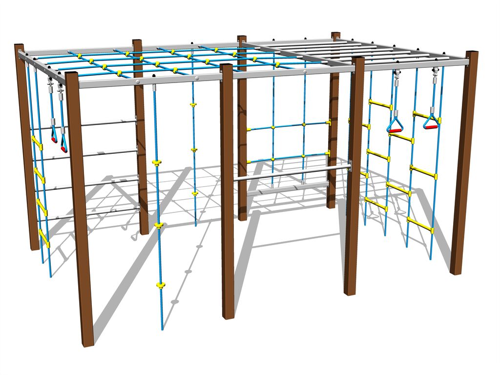 Die Seile und Netze sind aus Material HERKULES hergestellt (16 mm Seil aus Polypropylen mit einem inneren Stahlkern) und sind mit Kunststoff-Gelenken verbunden. Sämtliche Verbindungselemente sind verzinkt oder aus Edelstahl.