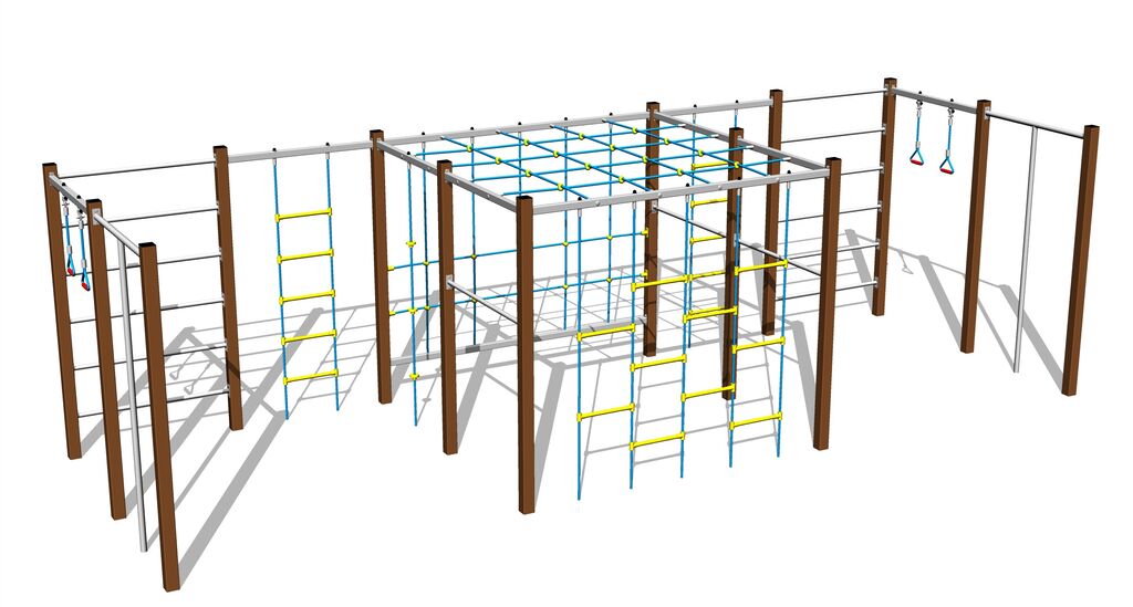 Die Seile und Netze sind aus Material HERKULES hergestellt (16 mm Seil aus Polypropylen mit einem inneren Stahlkern) und sind mit Kunststoff-Gelenken verbunden. Sämtliche Verbindungselemente sind verzinkt oder aus Edelstahl.