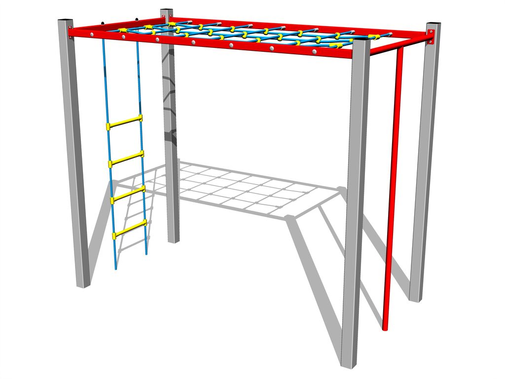 Die Seile und Netze sind aus Material HERKULES hergestellt (16 mm Seil aus Polypropylen mit einem inneren Stahlkern) und sind mit Kunststoff-Gelenken verbunden. Sämtliche Verbindungselemente sind verzinkt oder aus Edelstahl.