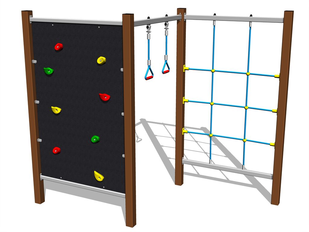 Die Seile und Netze sind aus Material HERKULES hergestellt (16 mm Seil aus Polypropylen mit einem inneren Stahlkern) und sind mit Kunststoff-Gelenken verbunden. Die Handgriffe bestehen aus Polyester, welche die Griffoberfläche griffig machen und eine hohe Farbbeständigkeit und Langlebigkeit garantieren. Sämtliche Verbindungselemente sind verzinkt oder aus Edelstahl.