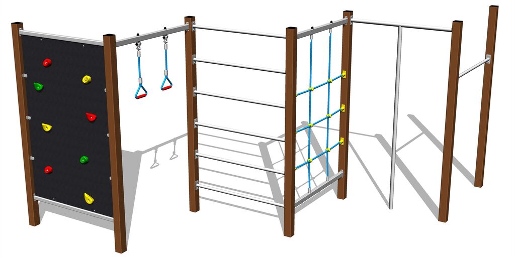 Kletterstange, Kletternetz, SproSSE8enwand, Steilkletterwand, Seilringe, Reckstange. Mehr Informationen