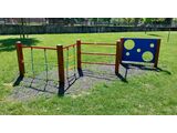 Die Seile und Netze sind aus Material HERKULES hergestellt (16 mm Seil aus Polypropylen mit einem inneren Stahlkern) und sind mit Kunststoff-Gelenken verbunden. Die Ballwand wird aus hochwertigem HDPE-Kunststoff hergestellt (durchgefärbtes Hochdruckpolyethylen, das sich durch hohe Farbstabilität, UV-Beständigkeit und vor allem Sicherheit zeichnet, weil er bruchfest ist, so daSS88 keine Verletzungsgefahr für Kinder durch scharfe Bruchstücke besteht). Das gesamte Verbindungsmaterial ist verzinkt oder aus Edelstahl.