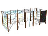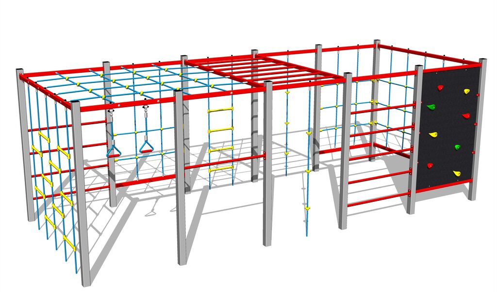 Die Seile und Netze sind aus Material HERKULES hergestellt (16 mm Seil aus Polypropylen mit einem inneren Stahlkern) und sind mit Kunststoff-Gelenken verbunden. Die Kletterwand besteht aus HPL (Hochdruck Laminat, das sich durch hohe Farbstabilität, Kratzfestigkeit, UV-Beständigkeit und Wasserbeständigkeit). Die Handgriffe aus Epoxidharz in Verbindung mit einer Quarzsandmischung, welche die Griffoberfläche griffig machen und eine hohe Farbbeständigkeit und Langlebigkeit garantieren. Sämtliche Verbindungselemente sind verzinkt oder aus Edelstahl.