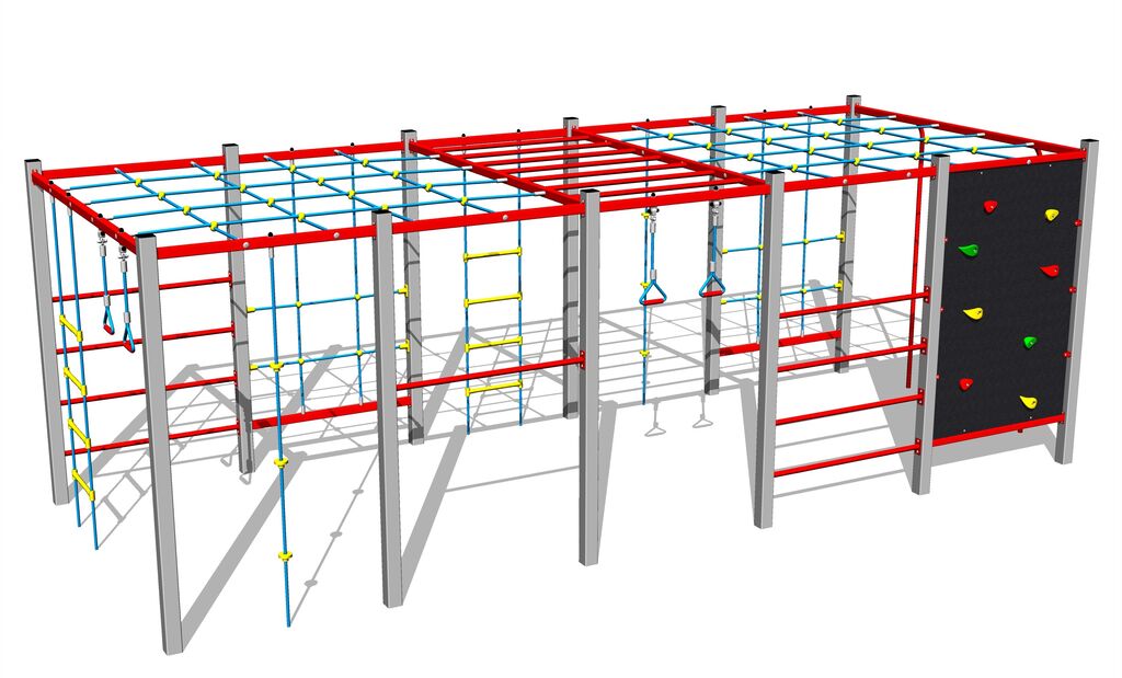 Die Seile und Netze sind aus Material HERKULES hergestellt (16 mm Seil aus Polypropylen mit einem inneren Stahlkern) und sind mit Kunststoff-Gelenken verbunden. Die Kletterwand besteht aus HPL (Hochdruck Laminat, das sich durch hohe Farbstabilität, Kratzfestigkeit, UV-Beständigkeit und Wasserbeständigkeit). Die Handgriffe aus Epoxidharz in Verbindung mit einer Quarzsandmischung, welche die Griffoberfläche griffig machen und eine hohe Farbbeständigkeit und Langlebigkeit garantieren. Sämtliche Verbindungselemente sind verzinkt oder aus Edelstahl.