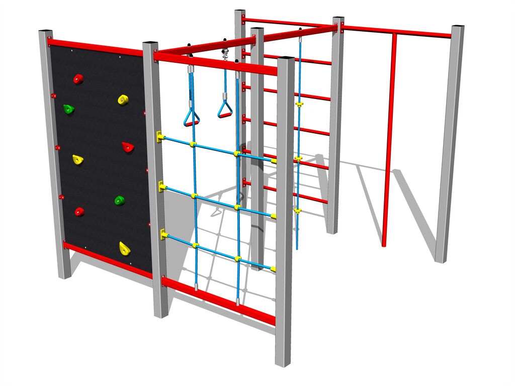Die Seile und Netze sind aus Material HERKULES hergestellt (16 mm Seil aus Polypropylen mit einem inneren Stahlkern) und sind mit Kunststoff-Gelenken verbunden. Die Kletterwand besteht aus HPL (Hochdruck Laminat, das sich durch hohe Farbstabilität, Kratzfestigkeit, UV-Beständigkeit und Wasserbeständigkeit). Die Handgriffe aus Epoxidharz in Verbindung mit einer Quarzsandmischung, welche die Griffoberfläche griffig machen und eine hohe Farbbeständigkeit und Langlebigkeit garantieren. Sämtliche Verbindungselemente sind verzinkt oder aus Edelstahl.