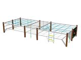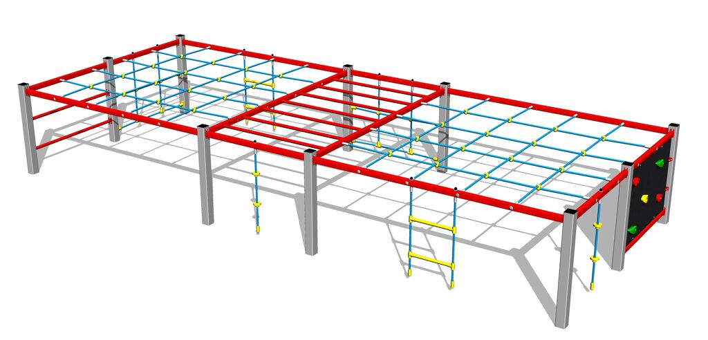 Die Seile und Netze sind aus Material HERKULES hergestellt (16 mm Seil aus Polypropylen mit einem inneren Stahlkern) und sind mit Kunststoff-Gelenken verbunden. Die Kletterwand besteht aus HPL (Hochdruck Laminat, das sich durch hohe Farbstabilität, Kratzfestigkeit, UV-Beständigkeit und Wasserbeständigkeit). Die Handgriffe aus Epoxidharz in Verbindung mit einer Quarzsandmischung, welche die Griffoberfläche griffig machen und eine hohe Farbbeständigkeit und Langlebigkeit garantieren. Sämtliche Verbindungselemente sind verzinkt oder aus Edelstahl.