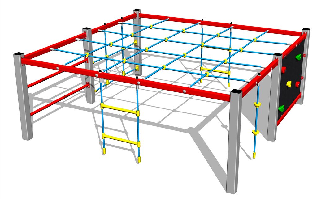 Die Seile und Netze sind aus Material HERKULES hergestellt (16 mm Seil aus Polypropylen mit einem inneren Stahlkern) und sind mit Kunststoff-Gelenken verbunden. Die Kletterwand besteht aus HPL (Hochdruck Laminat, das sich durch hohe Farbstabilität, Kratzfestigkeit, UV-Beständigkeit und Wasserbeständigkeit). Die Handgriffe aus Epoxidharz in Verbindung mit einer Quarzsandmischung, welche die Griffoberfläche griffig machen und eine hohe Farbbeständigkeit und Langlebigkeit garantieren. Sämtliche Verbindungselemente sind verzinkt oder aus Edelstahl.