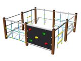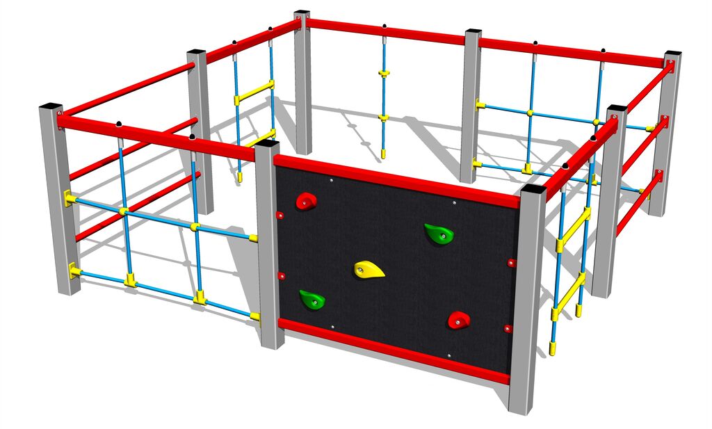 Die Seile und Netze sind aus Material HERKULES hergestellt (16 mm Seil aus Polypropylen mit einem inneren Stahlkern) und sind mit Kunststoff-Gelenken verbunden. Die Kletterwand besteht aus HPL (Hochdruck Laminat, das sich durch hohe Farbstabilität, Kratzfestigkeit, UV-Beständigkeit und Wasserbeständigkeit). Die Handgriffe aus Epoxidharz in Verbindung mit einer Quarzsandmischung, welche die Griffoberfläche griffig machen und eine hohe Farbbeständigkeit und Langlebigkeit garantieren. Sämtliche Verbindungselemente sind verzinkt oder aus Edelstahl.