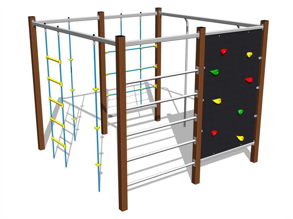 Die Seile und Netze sind aus Material HERKULES hergestellt (16 mm Seil aus Polypropylen mit einem inneren Stahlkern) und sind mit Kunststoff-Gelenken verbunden. Die Kletterwand besteht aus HPL (Hochdruck Laminat, das sich durch hohe Farbstabilität, Kratzfestigkeit, UV-Beständigkeit und WaSSE88erbeständigkeit). Die Handgriffe aus Epoxidharz in Verbindung mit einer Quarzsandmischung, welche die Griffoberfläche griffig machen und eine hohe Farbbeständigkeit und Langlebigkeit garantieren. Sämtliche Verbindungselemente sind verzinkt oder aus Edelstahl.