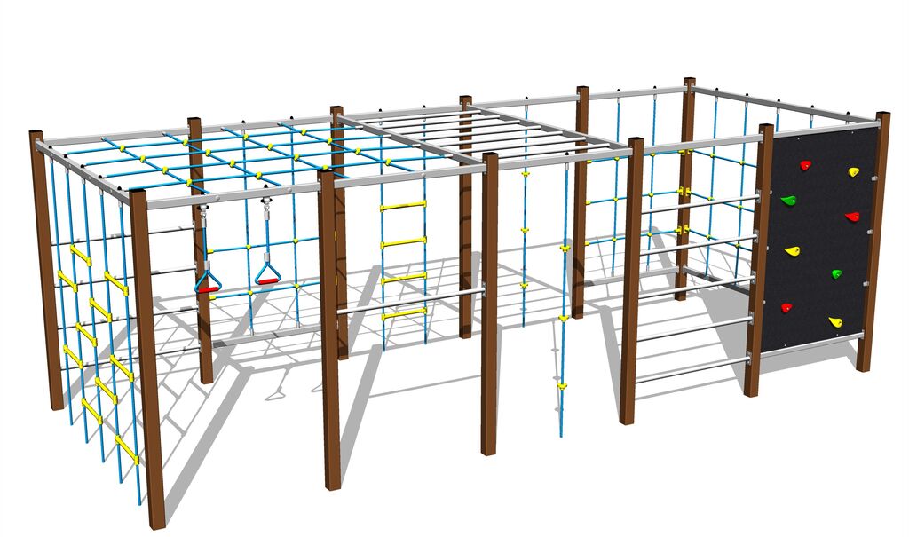 Die Seile und Netze sind aus Material HERKULES hergestellt (16 mm Seil aus Polypropylen mit einem inneren Stahlkern) und sind mit Kunststoff-Gelenken verbunden. Die Kletterwand besteht aus HPL (Hochdruck Laminat, das sich durch hohe Farbstabilität, Kratzfestigkeit, UV-Beständigkeit und Wasserbeständigkeit). Die Handgriffe aus Epoxidharz in Verbindung mit einer Quarzsandmischung, welche die Griffoberfläche griffig machen und eine hohe Farbbeständigkeit und Langlebigkeit garantieren. Sämtliche Verbindungselemente sind verzinkt oder aus Edelstahl.
