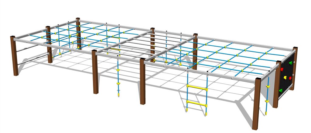 Die Seile und Netze sind aus Material HERKULES hergestellt (16 mm Seil aus Polypropylen mit einem inneren Stahlkern) und sind mit Kunststoff-Gelenken verbunden. Die Kletterwand besteht aus HPL (Hochdruck Laminat, das sich durch hohe Farbstabilität, Kratzfestigkeit, UV-Beständigkeit und Wasserbeständigkeit). Die Handgriffe aus Epoxidharz in Verbindung mit einer Quarzsandmischung, welche die Griffoberfläche griffig machen und eine hohe Farbbeständigkeit und Langlebigkeit garantieren. Sämtliche Verbindungselemente sind verzinkt oder aus Edelstahl.