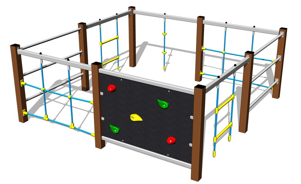 Die Seile und Netze sind aus Material HERKULES hergestellt (16 mm Seil aus Polypropylen mit einem inneren Stahlkern) und sind mit Kunststoff-Gelenken verbunden. Die Kletterwand besteht aus HPL (Hochdruck Laminat, das sich durch hohe Farbstabilität, Kratzfestigkeit, UV-Beständigkeit und Wasserbeständigkeit). Die Handgriffe aus Epoxidharz in Verbindung mit einer Quarzsandmischung, welche die Griffoberfläche griffig machen und eine hohe Farbbeständigkeit und Langlebigkeit garantieren. Sämtliche Verbindungselemente sind verzinkt oder aus Edelstahl.