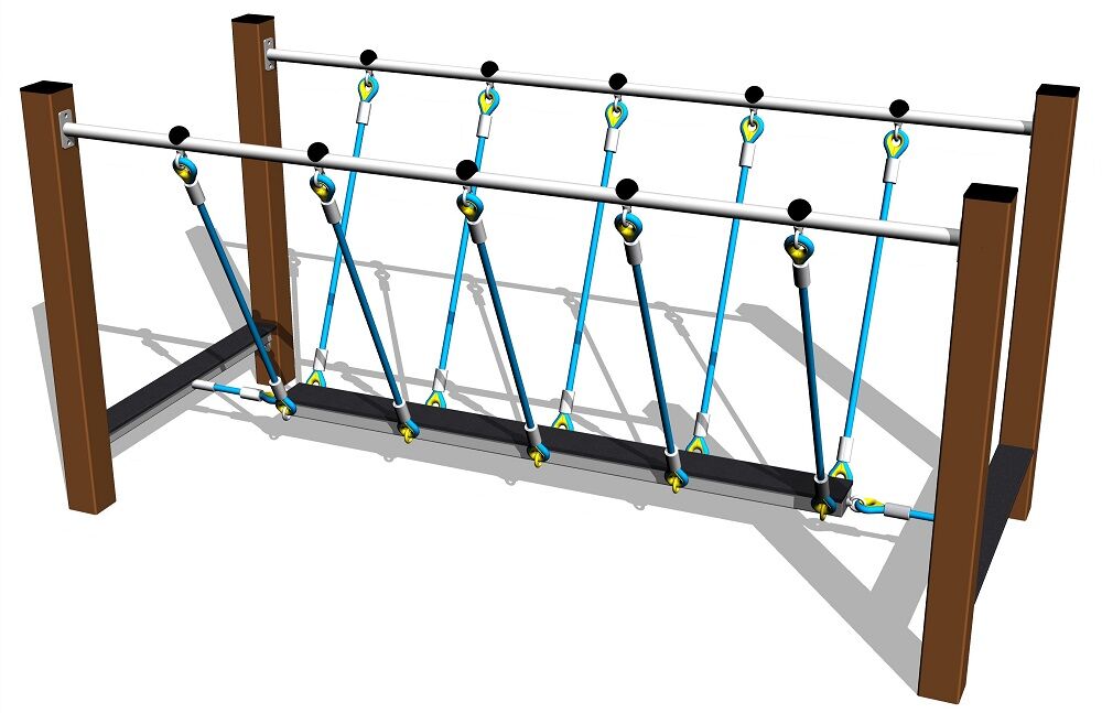 Seil-Balanciersteg mit Balken - metall, Länge 2 m, Als Fallschutzfläche genügt eine Grasfläche. Zur Auswahl stehen zwei Farbvarianten der Konstruktion – Braun und Silber. Mehr Informationen
