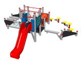 Die Rutsche besteht aus Fiberglas. Die Anschlussplatte, Barrieren der Rutsche und die Stepperplatten bestehen aus hochwertigem HDPE-Kunststoff (durchgefärbtes Hochdruckpolyethylen, das sich durch hohe Farbstabilität, UV-Beständigkeit und vor allem Sicherheit zeichnet, weil es bruchfest ist und so droht es keine Verletzungsgefahr durch scharfe Bruchteile). Die Seile und Netze sind aus Material HERKULES hergestellt (16 mm Seil aus Polypropylen mit einem inneren Stahlkern) und sind mit Kunststoff-Gelenken verbunden. Die Kriechtunnels werden aus Fiberglas hergestellt, der UV-beständig ist und der sich durch hohe Farbstabilität zeichnet. Die Plattform bestehen aus HPL (Hochdruck Laminat, das sich durch hohe Farbstabilität, Kratzfestigkeit und Wasserbeständigkeit). Das gesamte Verbindungsmaterial ist verzinkt oder aus Edelstahl.
