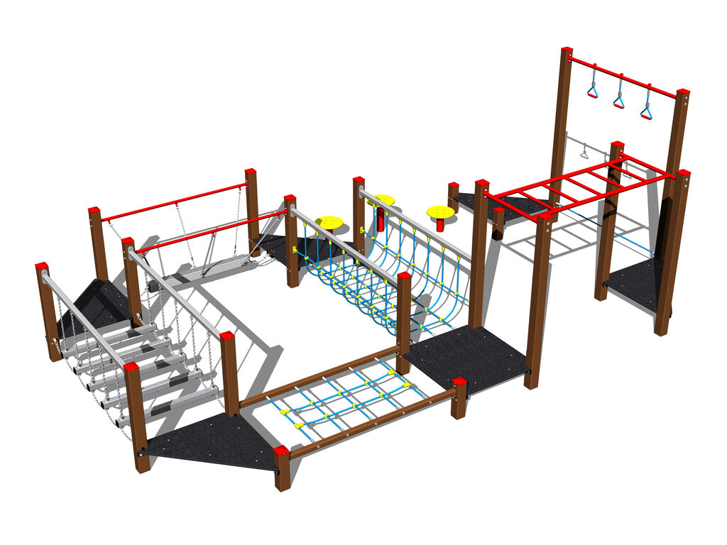 Übungspfad SD105K - metall, Fallhöhe 1 m, Als Fallschutzfläche genügt eine Grasfläche. Zur Auswahl stehen drei Farbvarianten der Konstruktion – Braun, Blau und Rot. Mehr Informationen