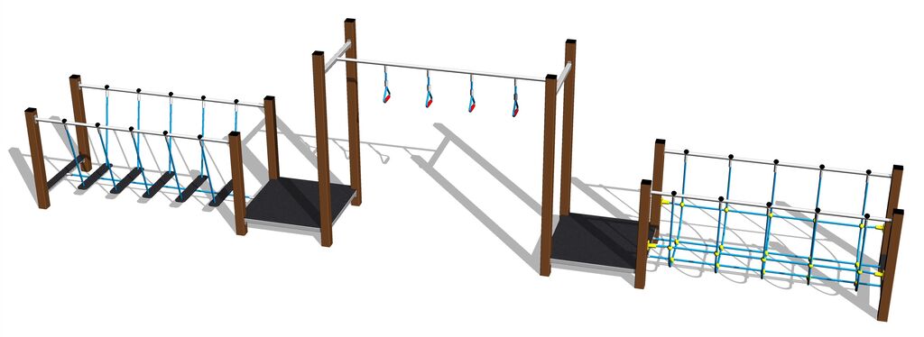 Übungspfad - metall, Fallhöhe 1 m. Als Fallschutzfläche genügt eine Grasfläche. Zur Auswahl stehen zwei Farbvarianten der Konstruktion – Braun und Silber. Mehr Informationen