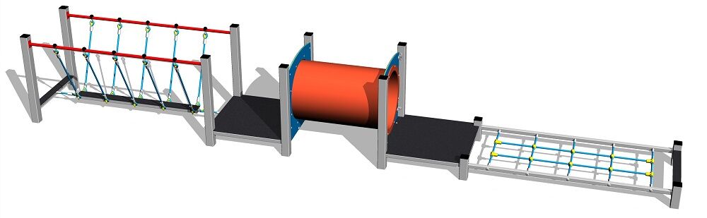 Die Tragkonstruktion des Übungspfads besteht aus Konstruktionsstahl, die gegen Korrosion mit Zinkbeschichtung geschützt wird oder die Duplexbeschichtung mit Pulvereinbrennfarbe nach der RAL geschützt. Diese Konstruktionen sind im Beton verankert. Die gesamten Metallelemente sind auch verzinkt oder die Duplexbeschichtung mit Pulvereinbrennfarbe nach der RAL geschützt. Die Seile und Netze sind aus Material HERKULES hergestellt (16 mm Seil aus Polypropylen mit einem inneren Stahlkern) und sind mit Kunststoff-Gelenken verbunden. Die Kriechtunnels werden aus Polyethylen, der UV-beständig ist und der sich durch hohe Farbstabilität zeichnet. Die Plattform bestehen aus HPL (Hochdruck Laminat, das sich durch hohe Farbstabilität, Kratzfestigkeit und Wasserbeständigkeit). Das gesamte Verbindungsmaterial ist verzinkt oder aus Edelstahl.