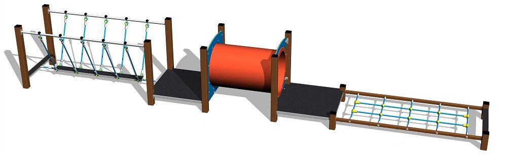 Die Tragkonstruktion des Übungspfads besteht aus Konstruktionsstahl, die gegen Korrosion mit Zinkbeschichtung geschützt wird oder die Duplexbeschichtung mit Pulvereinbrennfarbe nach der RAL geschützt. Diese Konstruktionen sind im Beton verankert. Die gesamten Metallelemente sind auch verzinkt oder die Duplexbeschichtung mit Pulvereinbrennfarbe nach der RAL geschützt. Die Seile und Netze sind aus Material HERKULES hergestellt (16 mm Seil aus Polypropylen mit einem inneren Stahlkern) und sind mit Kunststoff-Gelenken verbunden. Die Kriechtunnels werden aus Polyethylen, der UV-beständig ist und der sich durch hohe Farbstabilität zeichnet. Die Plattform bestehen aus HPL (Hochdruck Laminat, das sich durch hohe Farbstabilität, Kratzfestigkeit und Wasserbeständigkeit). Das gesamte Verbindungsmaterial ist verzinkt oder aus Edelstahl.