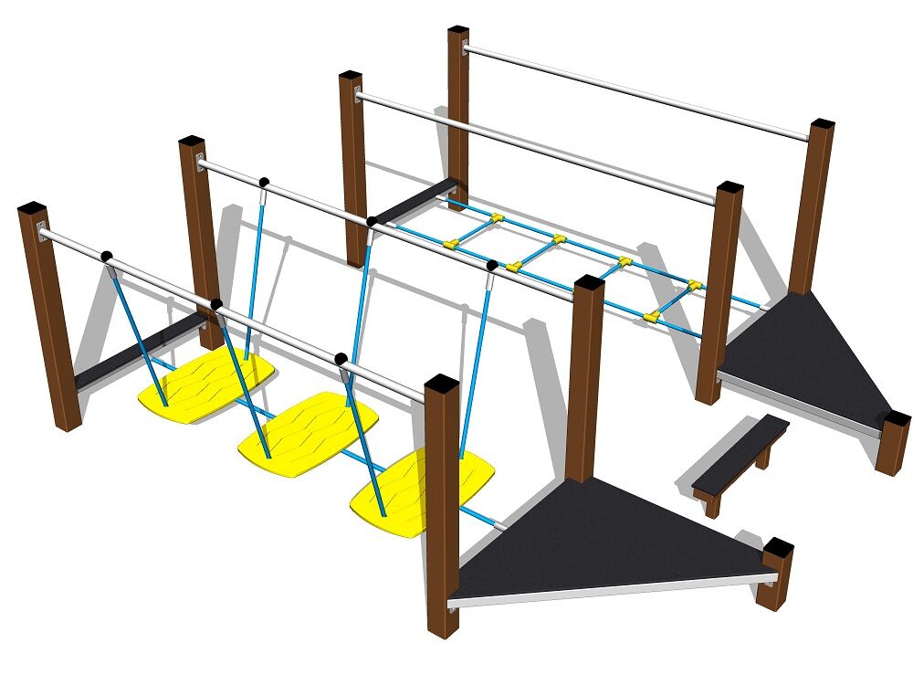 Übungspfad - metall, Fallhöhe 1 m. Als Fallschutzfläche genügt eine Grasfläche. Zur Auswahl stehen zwei Farbvarianten der Konstruktion – Braun und Silber. Mehr Informationen