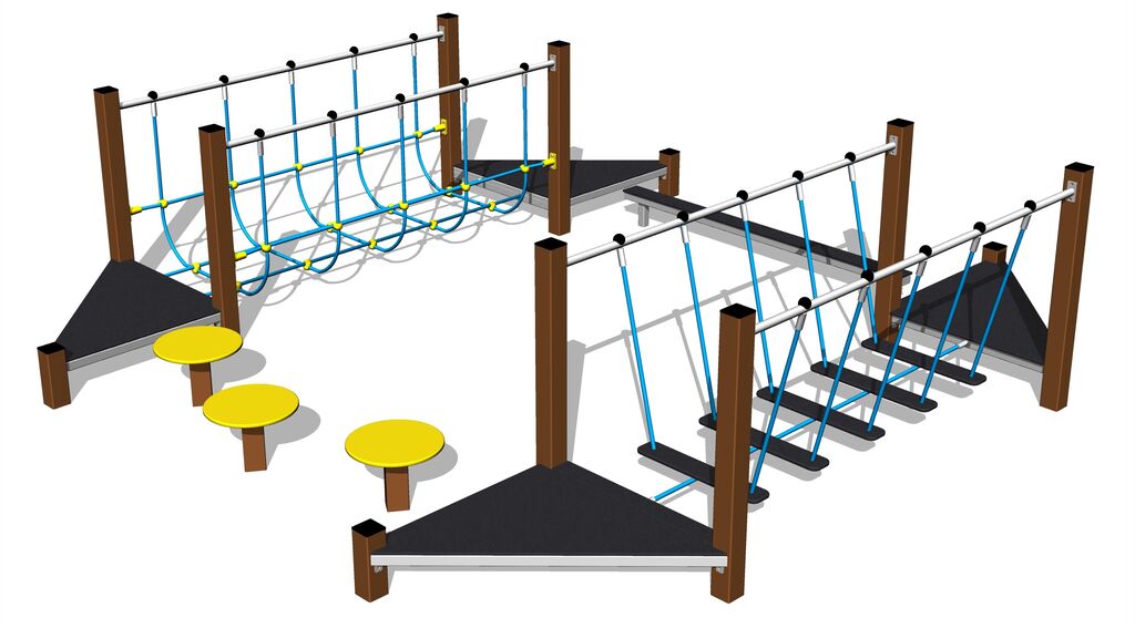 Übungspfad - metall, Fallhöhe 1 m. Als Fallschutzfläche genügt eine Grasfläche. Zur Auswahl stehen zwei Farbvarianten der Konstruktion – Braun und Silber. Mehr Informationen