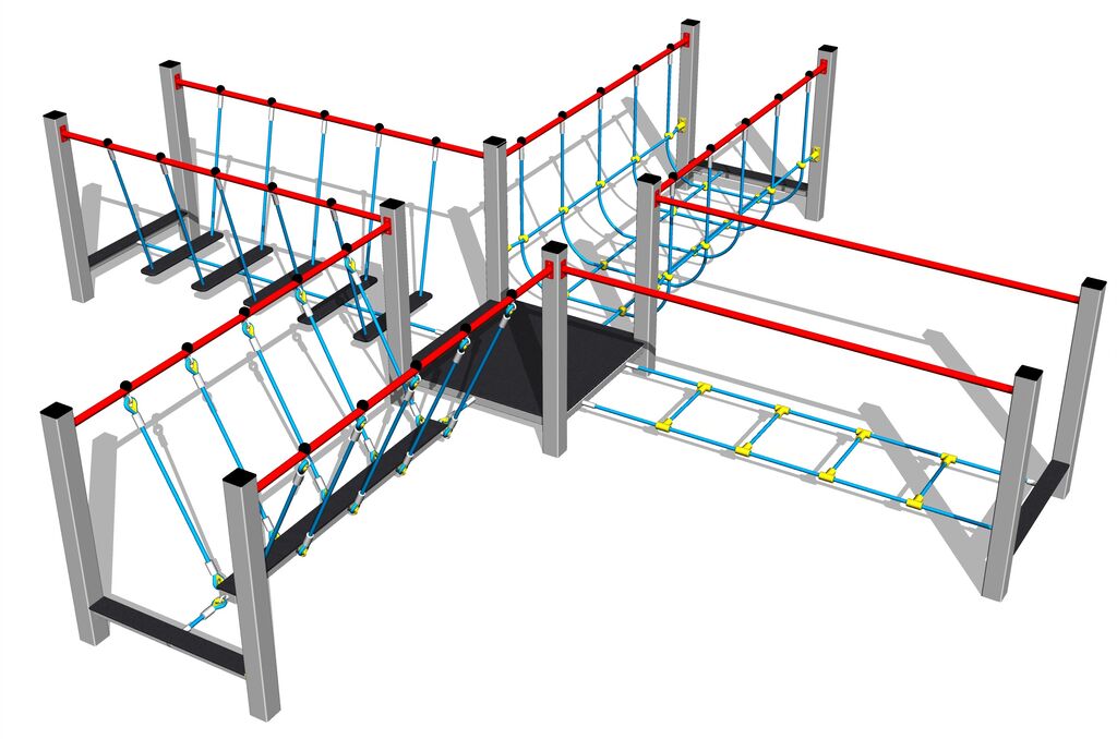 Übungspfad - metall, Fallhöhe 1 m. Als Fallschutzfläche genügt eine Grasfläche. Zur Auswahl stehen zwei Farbvarianten der Konstruktion – Braun und Silber. Mehr Informationen