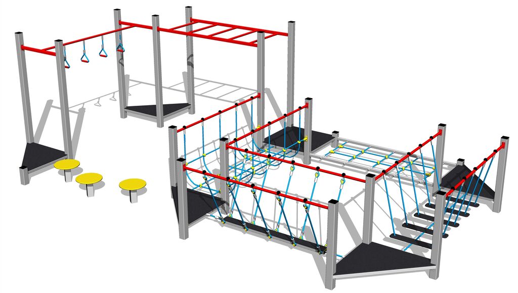 Übungspfad - metall, Fallhöhe 1 m. Als Fallschutzfläche genügt eine Grasfläche. Zur Auswahl stehen zwei Farbvarianten der Konstruktion – Braun und Silber. Mehr Informationen