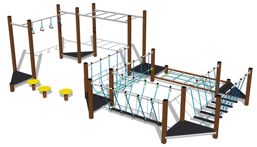 Übungspfad - metall, Fallhöhe 1 m. Als Fallschutzfläche genügt eine Grasfläche. Zur Auswahl stehen zwei Farbvarianten der Konstruktion – Braun und Silber. Mehr Informationen