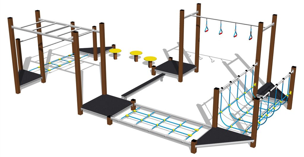 Übungspfad - metall, Fallhöhe 1 m. Als Fallschutzfläche genügt eine Grasfläche. Zur Auswahl stehen zwei Farbvarianten der Konstruktion – Braun und Silber. Mehr Informationen