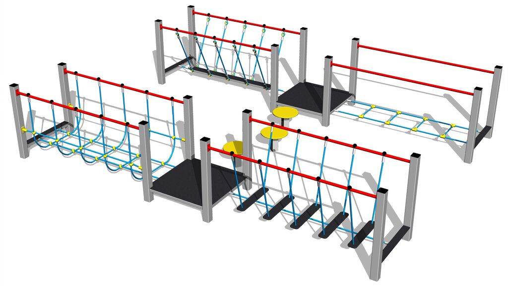 Übungspfad - metall, Fallhöhe 1 m. Als Fallschutzfläche genügt eine Grasfläche. Zur Auswahl stehen zwei Farbvarianten der Konstruktion – Braun und Silber. Mehr Informationen