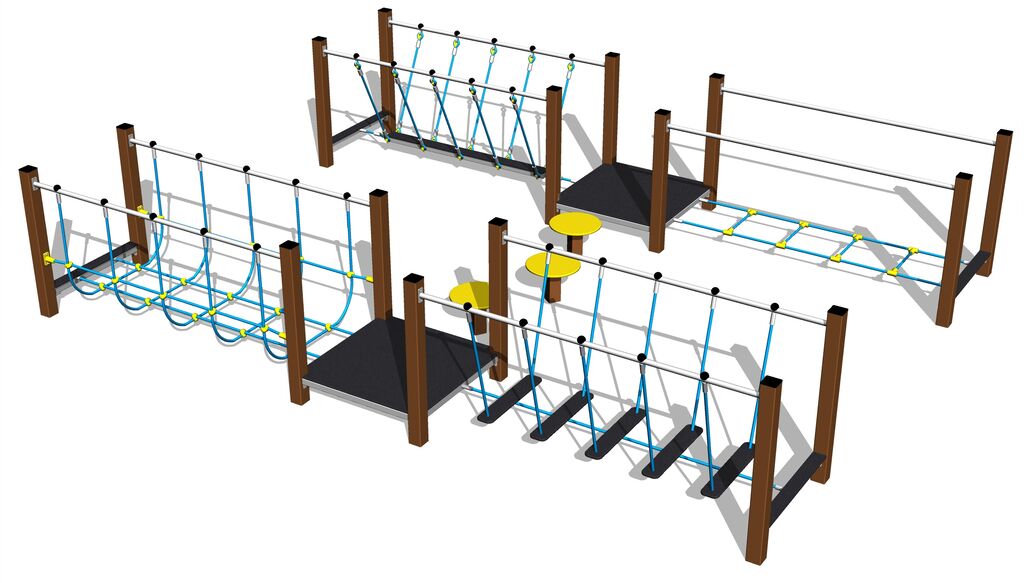 Übungspfad - metall, Fallhöhe 1 m. Als Fallschutzfläche genügt eine Grasfläche. Zur Auswahl stehen zwei Farbvarianten der Konstruktion – Braun und Silber. Mehr Informationen
