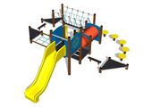 Diese Konstruktionen sind im Beton verankert. Die gesamten Metallelemente sind auch verzinkt oder die Duplexbeschichtung mit Pulvereinbrennfarbe nach der RAL geschützt. Die Rutsche besteht aus Fiberglas, die Anschlussplatte aus hochwertigem HDPE Kunststoff (Hart-Polyethylen – zeichnet sich durch seine Farbbeständigkeit und UV-Beständigkeit aus, aber vor allem durch Sicherheit, weil er bruchfest ist und somit keine Verletzungsgefahr mit scharfen Splittern für Kinder droht). Die Seile und Netze sind aus Material HERKULES hergestellt (16 mm Seil aus Polypropylen mit einem inneren Stahlkern) und sind mit Kunststoff-Gelenken verbunden. Die Kriechtunnels werden aus Polyethylen, der UV-beständig ist und der sich durch hohe Farbstabilität zeichnet. Die Stepperplatten bestehen aus hochwertigem HDPE-Kunststoff (durchgefärbtes Hochdruckpolyethylen, das sich durch hohe Farbstabilität, UV-Beständigkeit und vor allem Sicherheit zeichnet, weil es bruchfest ist und so droht es keine Verletzungsgefahr durch scharfe Bruchteile). Die Plattform bestehen aus HPL (Hochdruck Laminat, das sich durch hohe Farbstabilität, Kratzfestigkeit und Wasserbeständigkeit). Das gesamte Verbindungsmaterial ist verzinkt oder aus Edelstahl.