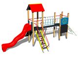 2x Turm, Dach in "A" form, Rutsche, Barriere, Steilaufstieg mit Metallhaltegriffen, Steilaufstieg mit Seil, Brücke mit Seilgeländern, Reckstangenaufstieg mit Haltegriffen, Steilkletternetz, Zeichentafel. Mehr Informationen