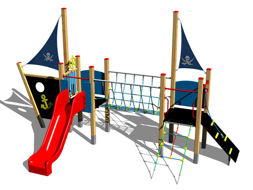 2x Turm, Rutsche, Metallsperre im Holzrahmen, 2x Mast mit Fahne, Steilaufstieg mit Seil, Seilbrücke, Steilkletternetz, Zeichentafel, Anker, Ruder, 2x Barriere aus HDPE. Mehr Informationen