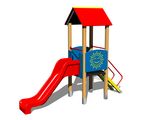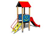 Turm, Rutsche, Dach in "A" form, 2x Barriere, Steilaufstieg mit Metallhaltegriffen. Mehr Informationen