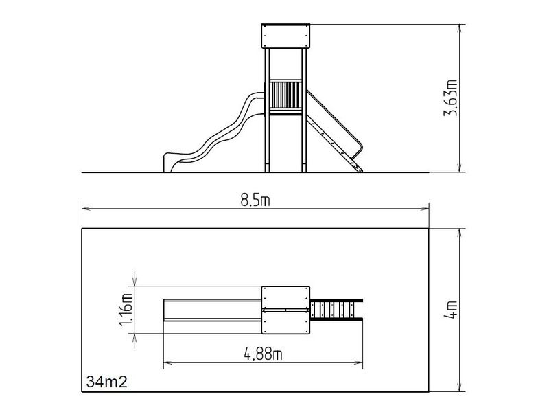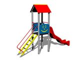 Turm, Rutsche, Dach in "A" form, 2x Barriere, Steilaufstieg mit Metallhaltegriffen. Mehr Informationen