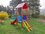 Turm, Rutsche, Dach in "A" form, 2x Barriere, Steilaufstieg mit Metallhaltegriffen. Mehr Informationen