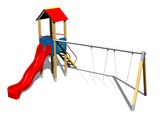 Sitz- und Schwenkgelenke sind nicht Teil der Schaukel. Es ist notwendig, einen Sitzplatz (2 Stück) nach Wahl und Drehgelenke (4 Stück) zu kaufen. Turm, Rutsche, Dach in "A" form, 2x Barriere, Steilaufstieg mit Metallhaltegriffen, Metallbalken. Mehr Informationen