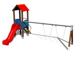 Sitz- und Schwenkgelenke sind nicht Teil der Schaukel. Es ist notwendig, einen Sitzplatz (2 Stück) nach Wahl und Drehgelenke (4 Stück) zu kaufen. Turm, Rutsche, Dach in "A" form, 2x Barriere, Steilaufstieg mit Metallhaltegriffen, Metallbalken. Mehr Informationen