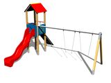 Sitz- und Schwenkgelenke sind nicht Teil der Schaukel. Es ist notwendig, einen Sitzplatz (2 Stück) nach Wahl und Drehgelenke (4 Stück) zu kaufen. Turm, Rutsche, Dach in "A" form, 2x Barriere, Steilaufstieg mit Seil, Ketten-Doppelschaukel. Mehr Informationen