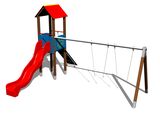 Sitz- und Schwenkgelenke sind nicht Teil der Schaukel. Es ist notwendig, einen Sitzplatz (2 Stück) nach Wahl und Drehgelenke (4 Stück) zu kaufen. Turm, Rutsche, Dach in "A" form, 2x Barriere, Steilaufstieg mit Seil, Ketten-Doppelschaukel. Mehr Informationen