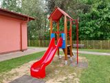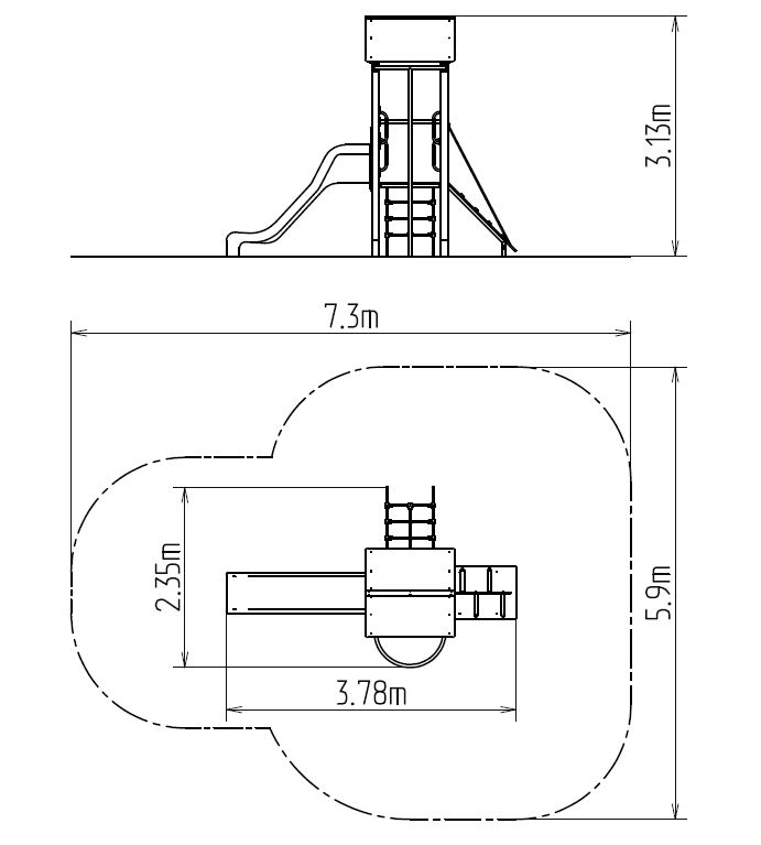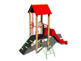 Turm, Rutsche, Dach in "A" form, Steilaufstieg mit Seil, Steilkletternetz, Feuerwehrstange. Mehr Informationen