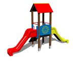 Turm, Dach in "A" form, 2x Rutsche, Barriere, Steilaufstieg mit Seil. Mehr Informationen